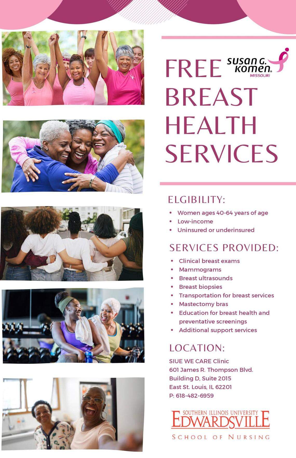 Southern Illinois University-Edwardsville’s WE CARE Clinic, in partnership with Susan G. Komen of Missouri, is offering a variety of free breast health services to low-income, uninsured or underinsured women ages 40-64. For more information, call 618-482-6959.